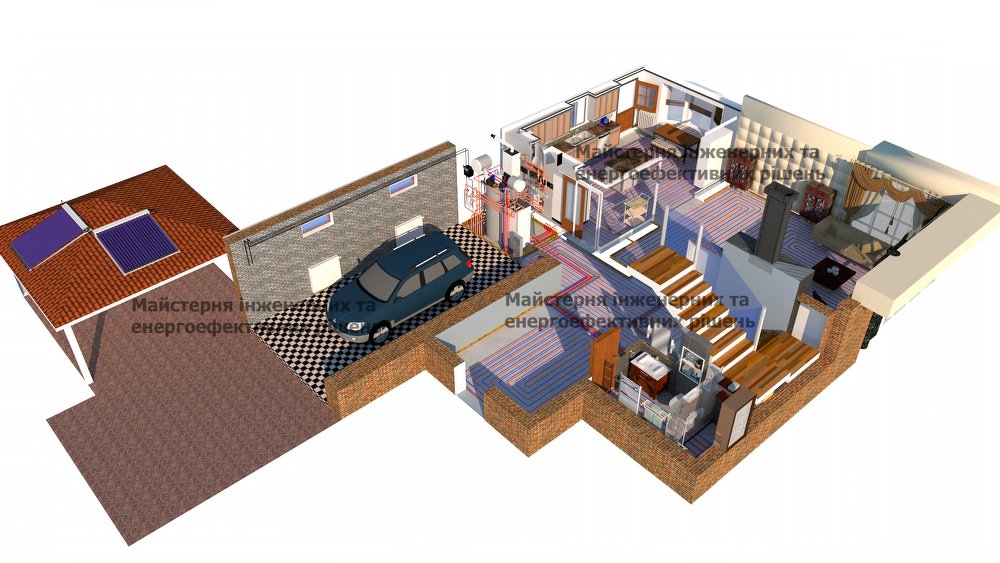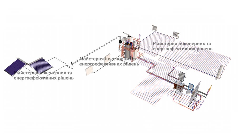 Пример 3. Монтаж отопления в Киеве, низкотемпературная радиаторная система которая работает с тепловым насосом.